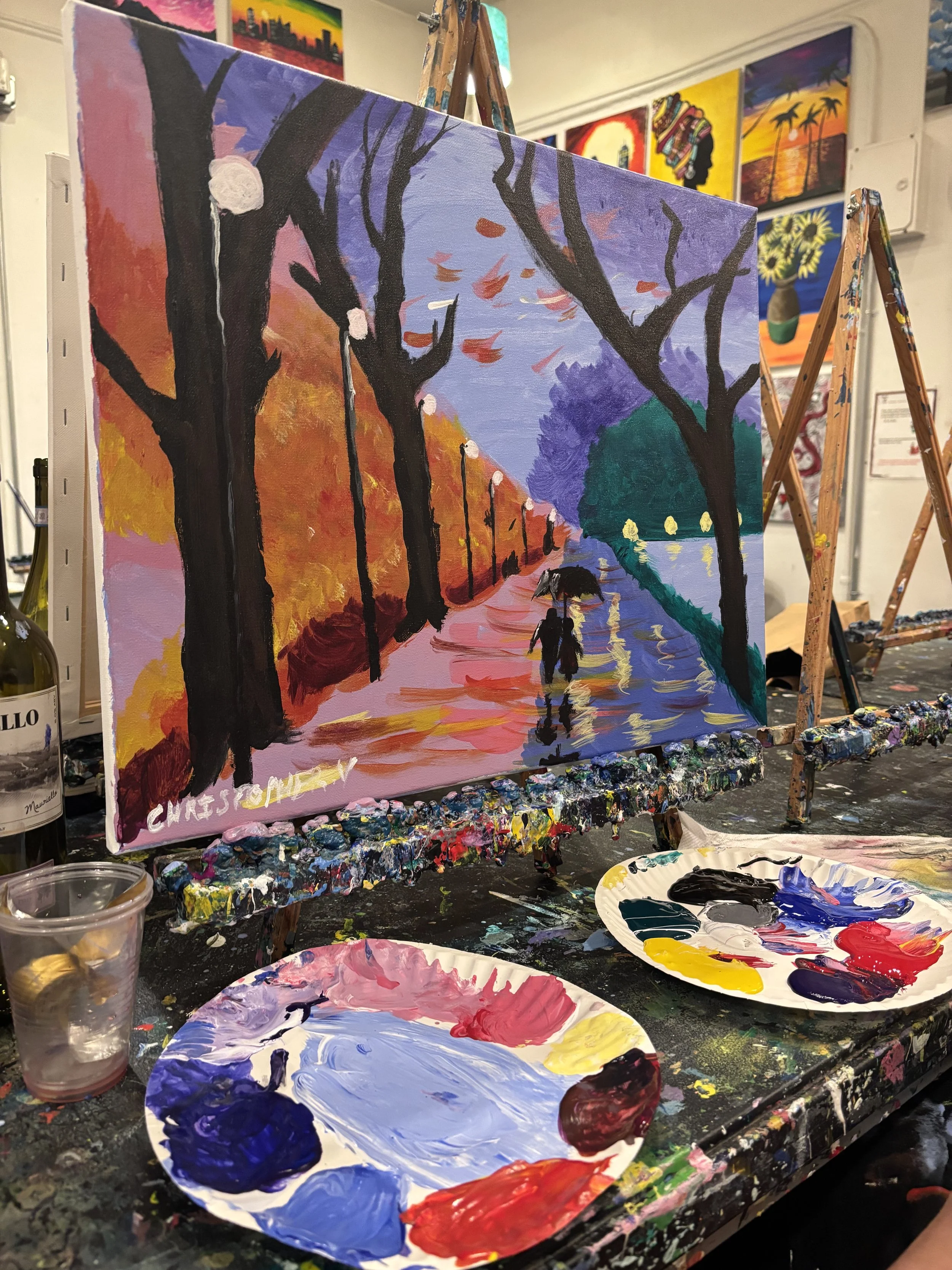 A bit more structured and lively—think guided painting + drinks + a social crowd.